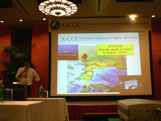 We sincerely thank you for your kind support and excellent presentation at A-COE. We have almost 120 attendees including 40 foreigners. The conference was successfully finished and we could spend fantastic time under the beautiful summer sky with comfort circumstance of the hotel Luigans. We hope that this conference will accelerate the research field of organic electronics, leading to intense collaboration within the Asia area. The formation of united states in Asia in research field will provide strong research team.